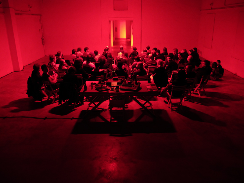 Janek Schaefer looked excited as always. In a brief speech, he presented his 'live composition', a recent work called 'Phoenix and Phedra holding patterns'. Several portable FM radios were arranged among the audience, used as additional speakers, giving more depth to the music and space feeling to the audience. The usual speakers were on the stage, for Schaefer chose to switch off all lights and 'manage' the performance from behind. Sitting in total darkness, we entered into Schaefer's composition like in a vast cathedral. The piece was organized like a soundtrack containing several grandiose and often loud episodes with gravity-free sounds and loops, Shruti box drones, and separated from each other by interludes made of transmission-like and field recordings. |