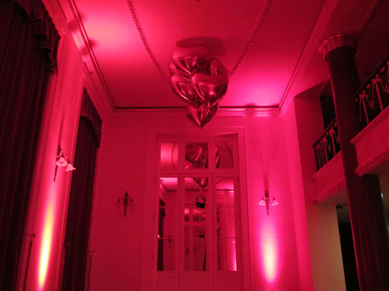 The scene is finally saturated with red light, red love balloons and red glitter heart confetti.