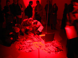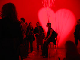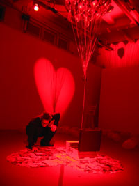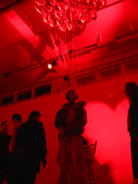 "Dozens of heart-shaped balloons stick to the wall on the 3rd floor gallery; one has the word 'Love' scrawled across it in cursive handwriting. During the last hours of UK experimentalist Janek Schaefer's haunting performance, the balloon has shrivled down to a tiny wrinkled mass. It's 2:00am, and beneath a rosy glow cast by the crimson globes overhead, Schaefer twiddles knobs until a low, mournful drone rises from his kit, warpng Jennifer Rush's 'Power of Love' so that the chanteuse moans like a demonic drag queen. 'I am your lady, and you are my man' she sighs, as if to clarify any gender confusion. In the centre of the room, two women slow-dance to the bizarre ballad, their exaggerated waltz looking like something from a David Lynch film. A handful of voyeurs watch transfixed. Three hours later, just before sunrise, Schaefer is as energetic as ever and wide awake expertly perverting his favourite love songs!"