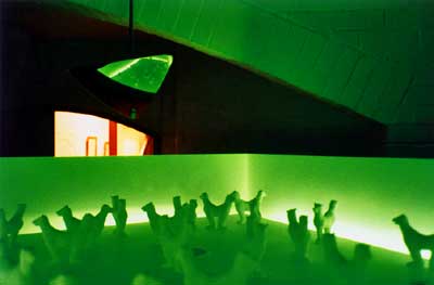 A herd of laughing Uleybeast on endless cassette in a tall incubator with overhead inspection mirror